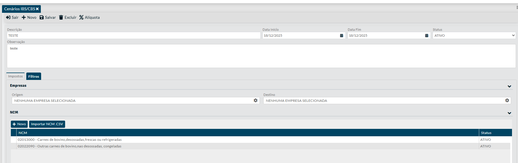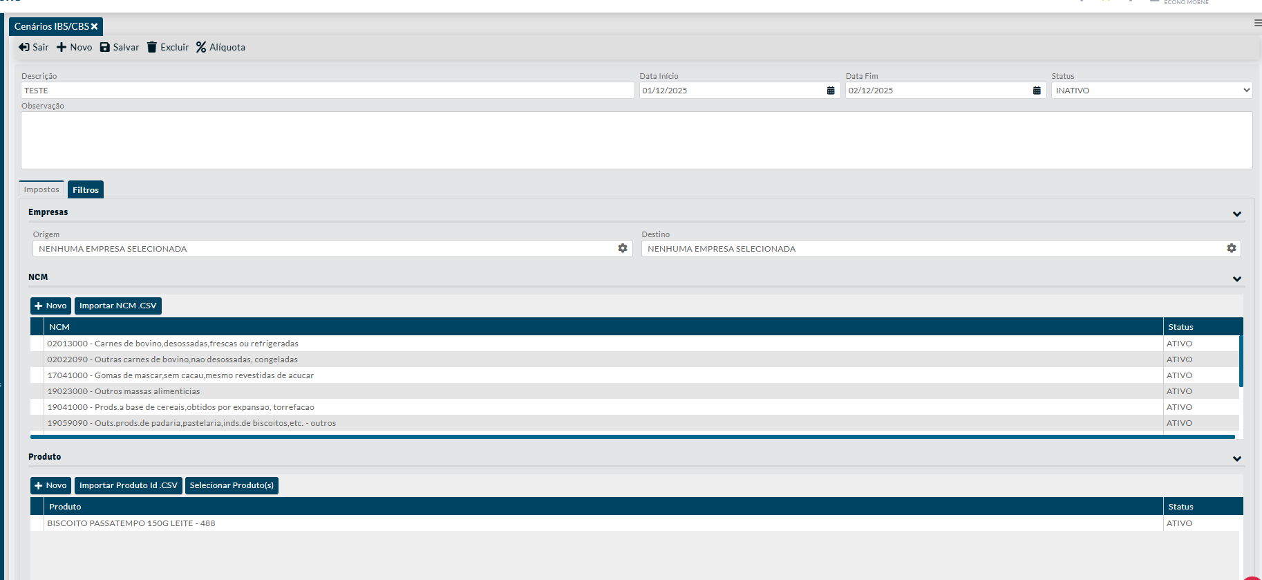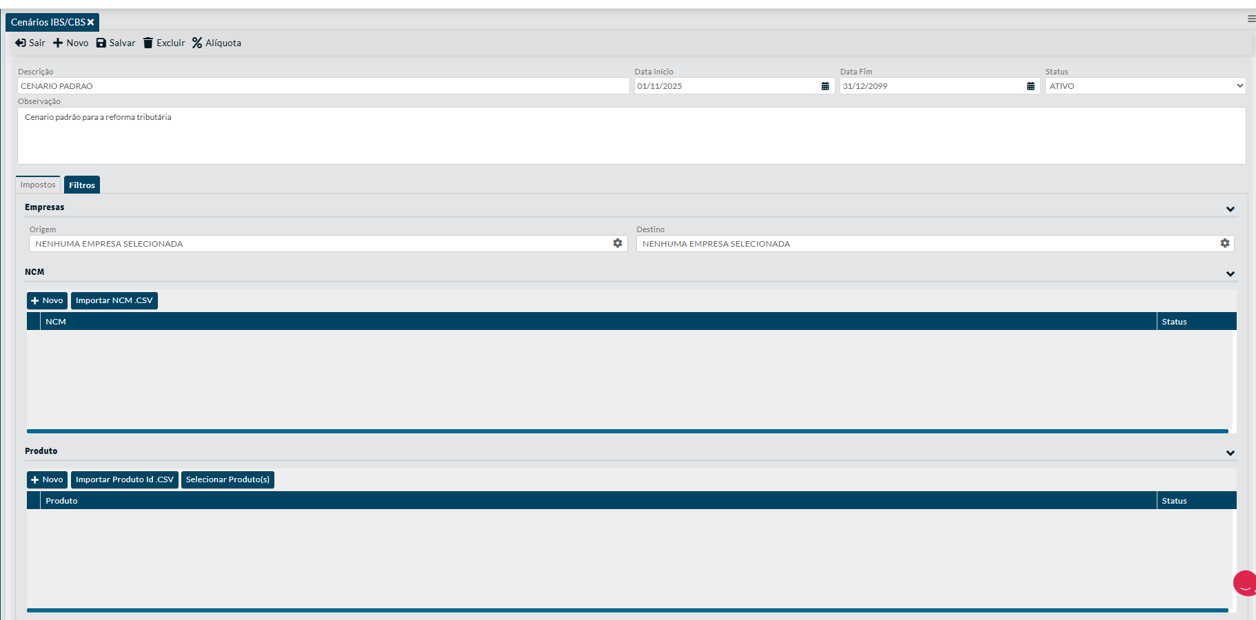 Os filtros foram criados para direcionar para quais Empresas, NCMs ou Produtos esse novo cenários vai ser aplicado.
